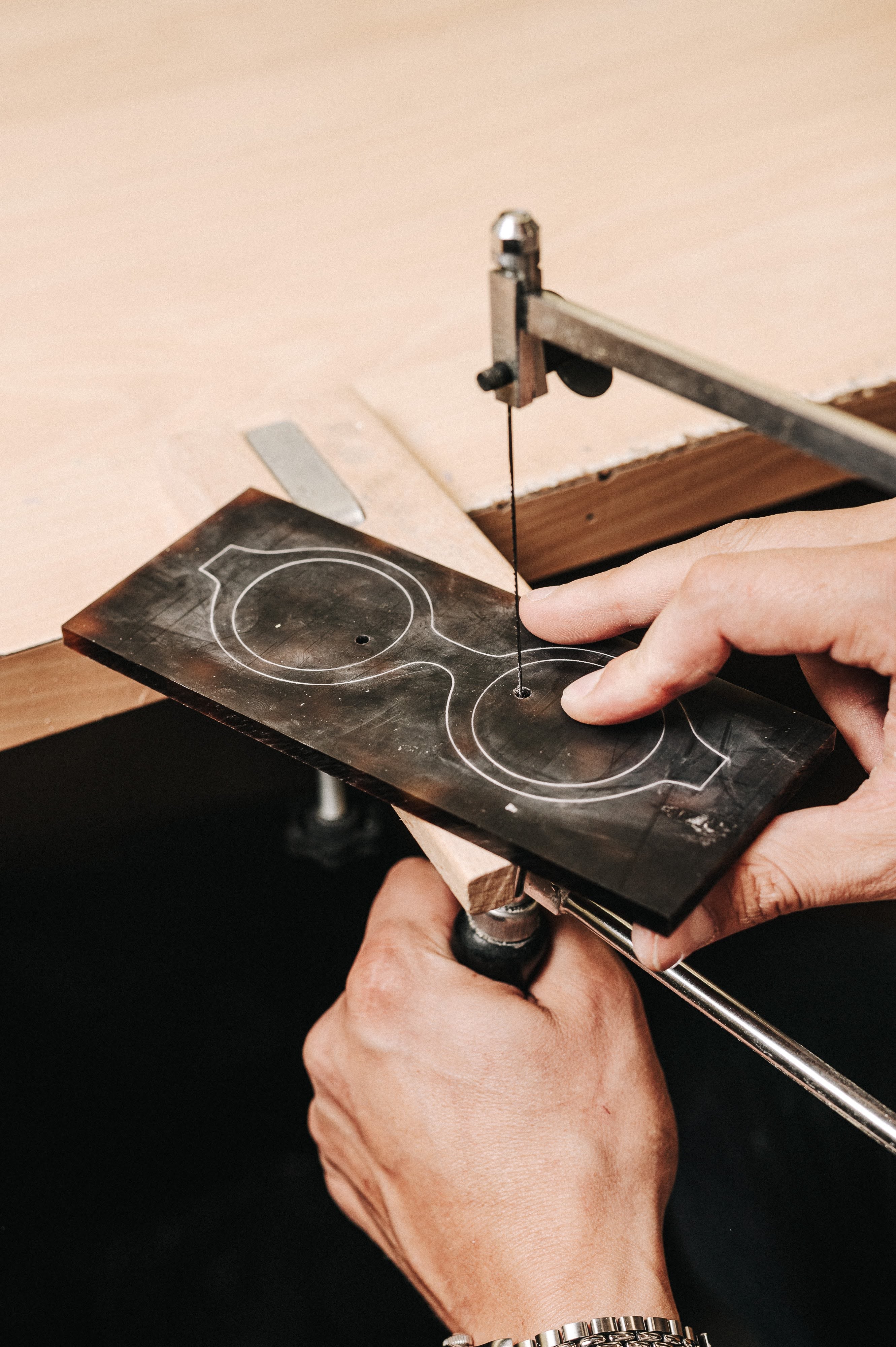Chaque monture y est entièrement réalisée à la main, pièce après pièce, à partir de plaques d’acétate de haute qualité française. De la conception du dessin jusqu’à la fabrication et l’ajustage final, Clément crée des lunettes uniques, pensées pour s’adapter parfaitement à chaque visage, à vos goûts, à vos envies et à vos mensurations.